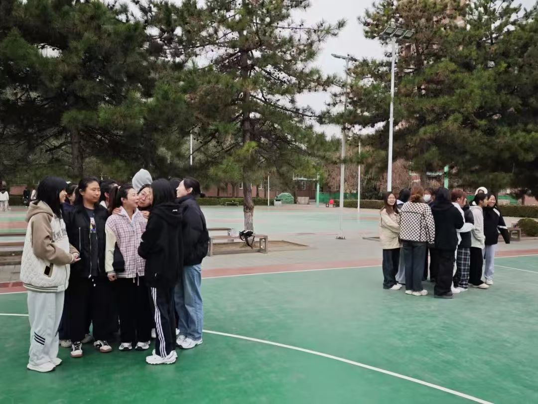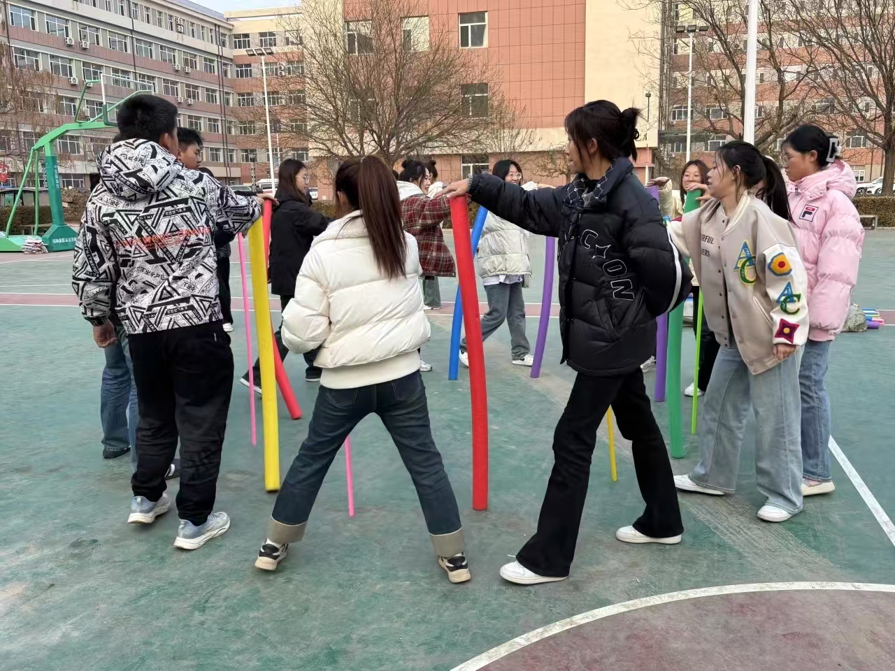 接着,大家迎来“不倒森林”的挑战。每组成员围成圈,每人右手掌心按在一根长杆上,左手背后。指令下达后,队员们要迅速移动步伐,将右手掌心移动到相邻同伴的杆上。这个游戏需要团队成员高度默契配合,考验大家的团队协作能力,只有齐心协力,才能让“森林”屹立不倒,获取下一个寻宝线索。