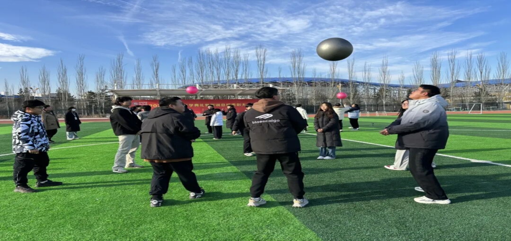 气球飞行的游戏充满了欢声笑语,久久未散。同学们被分成了几个小组来进行。这主要考验大家的团队协作能力。游戏要求是让瑜伽球在空中飞行,尽量不要落地,而且团队成员不可以用手掌或手指来接触瑜伽球。听到这个要求后,同学们纷纷开动脑筋,绞尽脑汁地想解决办法:有的采用打排球的手势,仿佛在与瑜伽球进行一场无声的空中对决;有的用膝盖将球传递,就像灵活的小机器人一样默契配合。