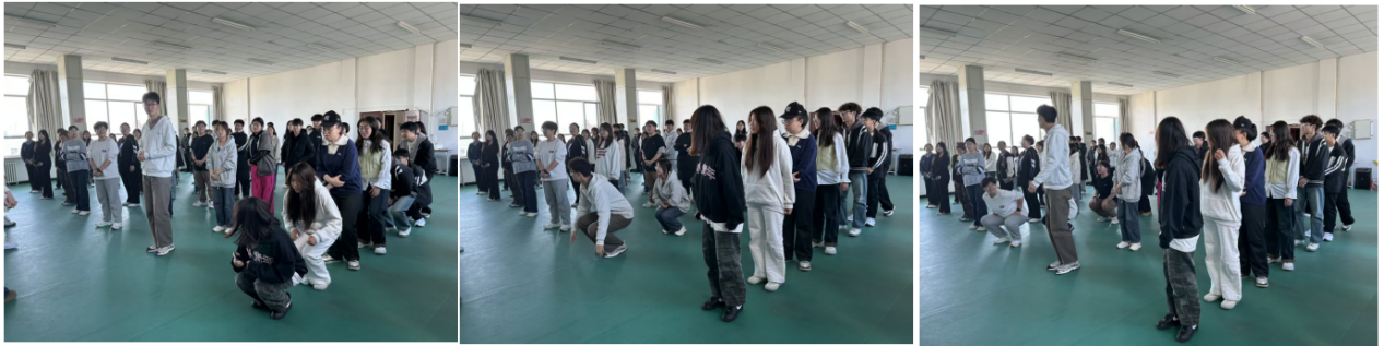 活动以“蹲七游戏”开场:众人依次报数,遇“7”或含“7”的数字便要立即下蹲躲避“数字炸弹”。既考验大家对数字的敏感程度,又考验头脑与身体的配合,紧张又刺激。每个人都握紧拳头,屏住呼吸,当团队顺利通过游戏后,才齐齐吐出一口气,笑着盼下一个游戏的到来。