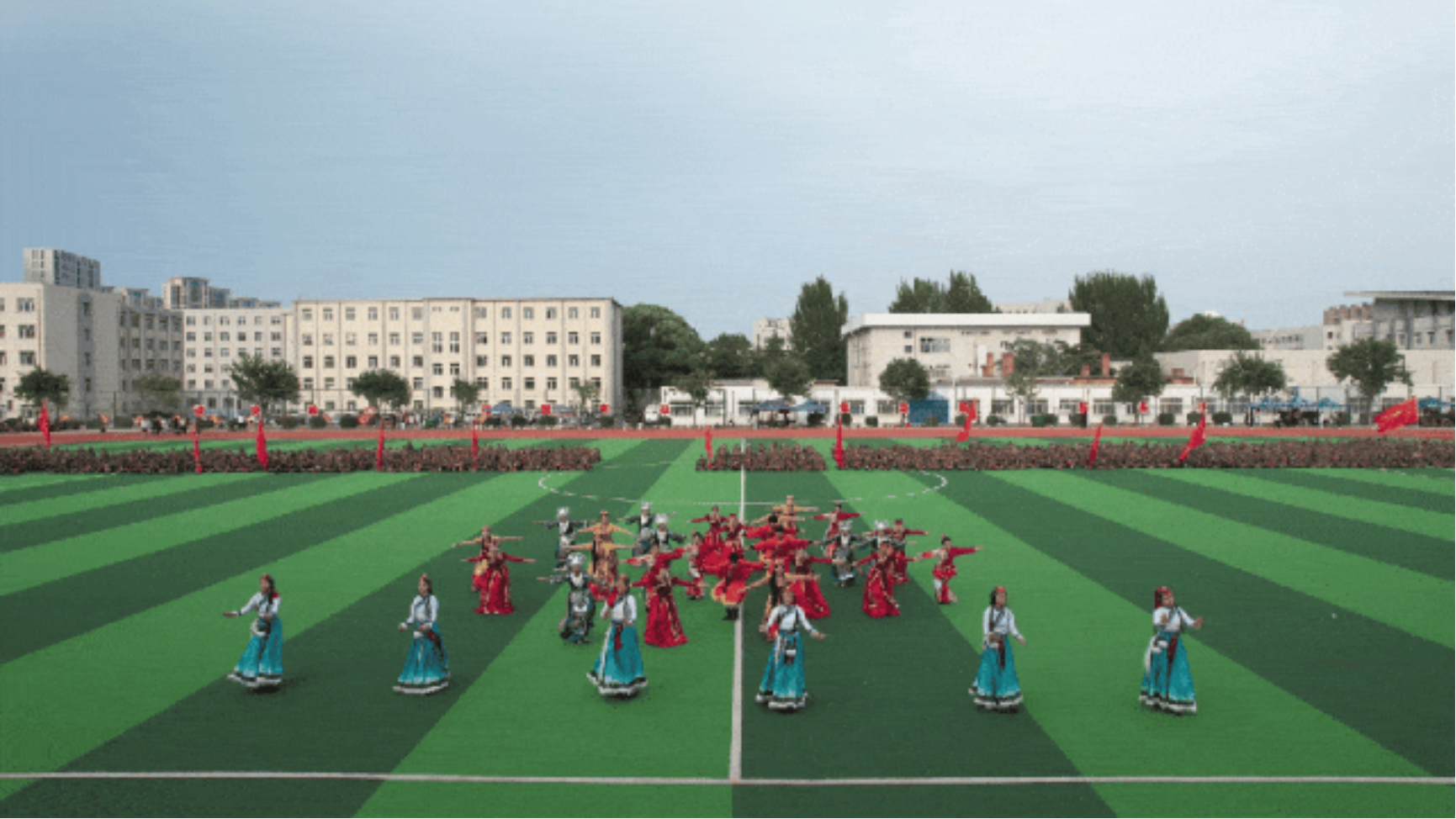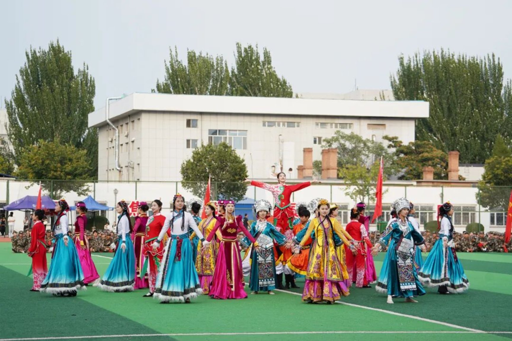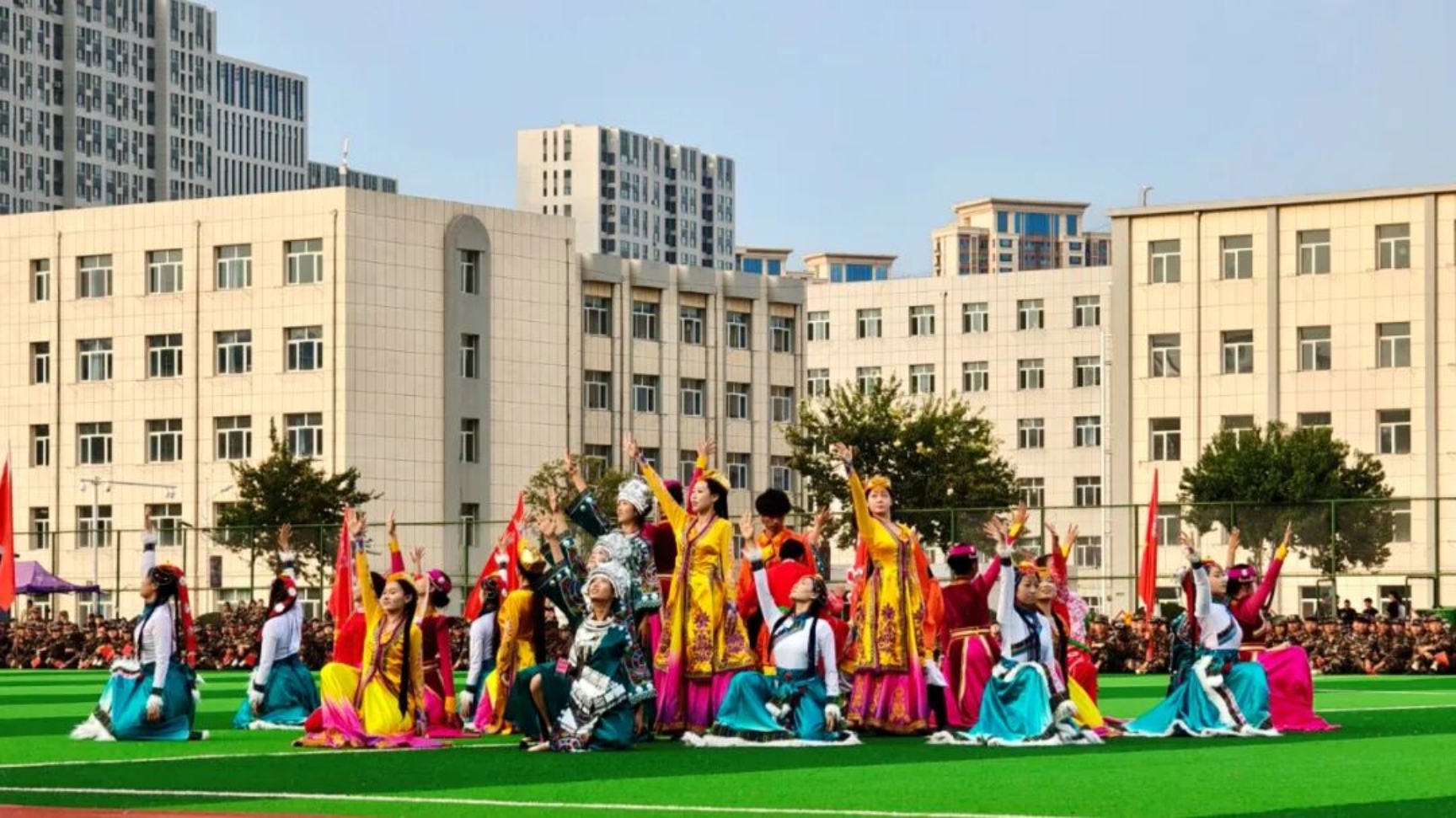 新生开学典礼暨军训总结表彰大会结束后,还上演了舞蹈《民族团结花盛开》、民族健身操《共舞盛会》、诗朗诵《有一盏灯》、大合唱《歌唱祖国》等精彩的文艺节目。