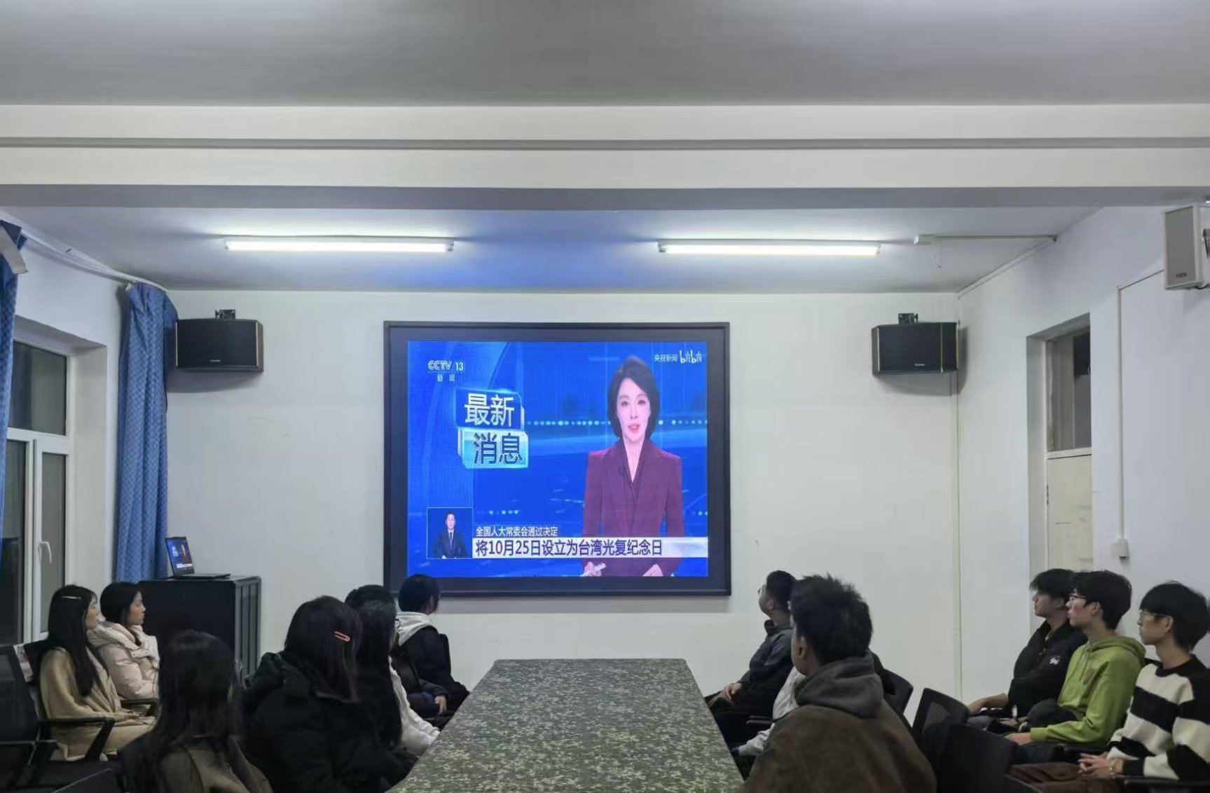 活动首先介绍了台湾光复的历史背景:1945年10月25日,台湾正式回归中国版图,这是全体中华儿女抗战胜利的重要成果。随后,师生们共同观看了相关新闻报道,深入了解全国人大常委会设立该纪念日的重大意义——以法律形式铭记历史,彰显台湾是中国不可分割的一部分。