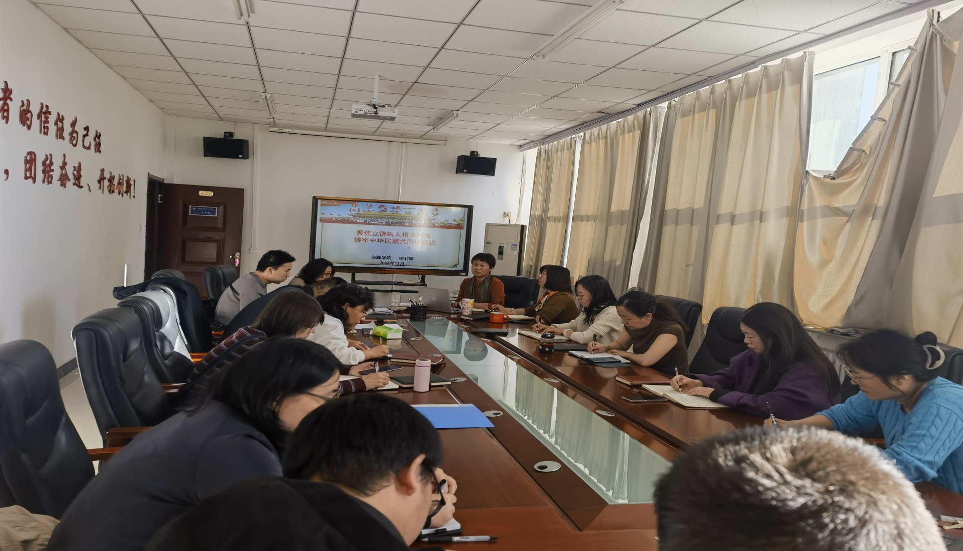 会后组织全体党员、教职工进行铸牢中华民族共同体专题学习。首先传达学习2024年9月习近平总书记在全国民族团结进步表彰大会上的重要讲话精神,接着分享了全国民族团结进步模范个人、赤峰市林西县城南街道党工委书记张志伟应邀作的先进事迹报告。最后学报党支部书记徐利颖为大家开展了《聚焦立德树人根本任务 铸牢中华民族共同体意识》专题党课。