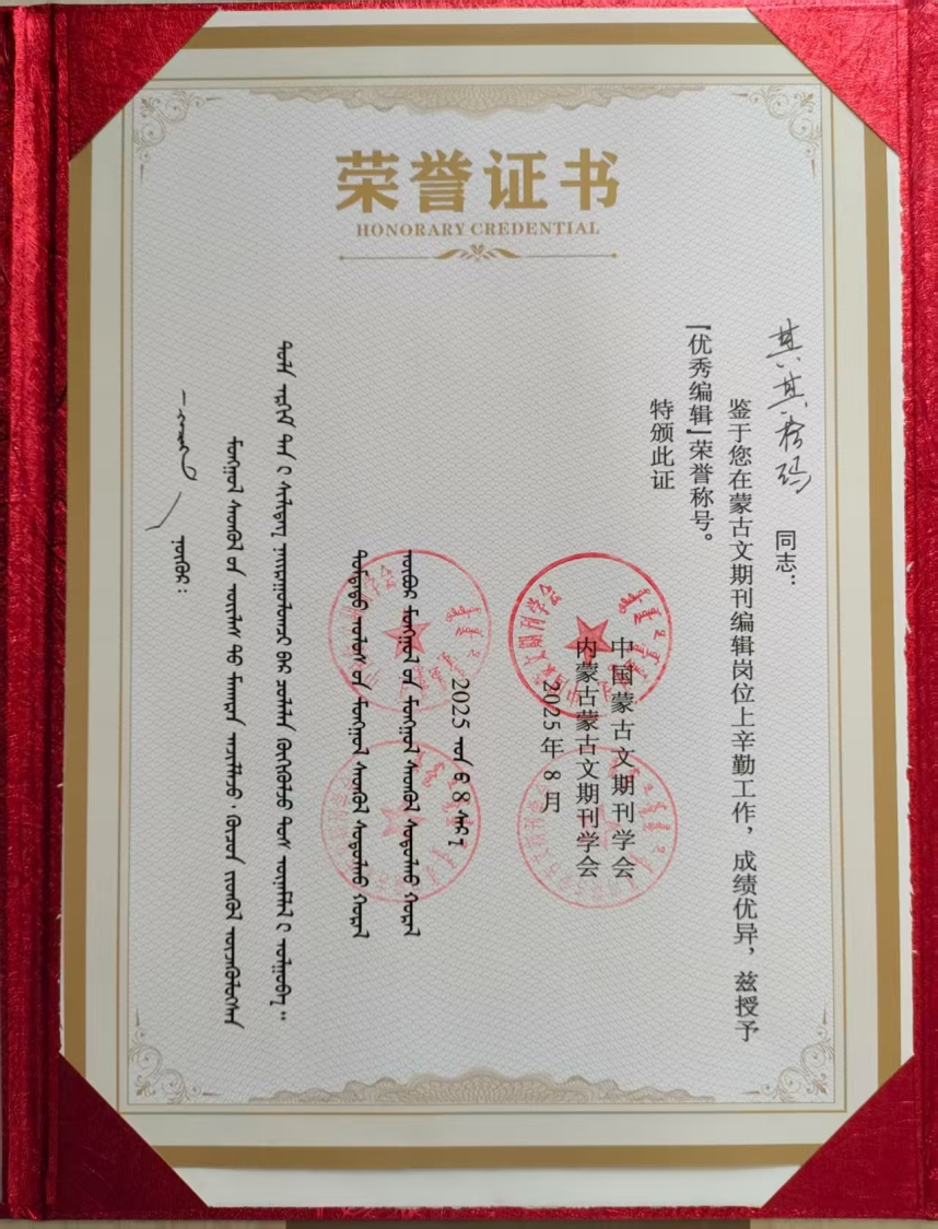 2025年8月29日至31日,蒙古文期刊界学习贯彻习近平文化思想专题培训会暨中国(内蒙古)蒙古文期刊学会第39次年会在鄂尔多斯市隆重召开。beat365蒙古文期刊编辑其其格玛同志在此次会议上荣获“优秀编辑”荣誉称号。