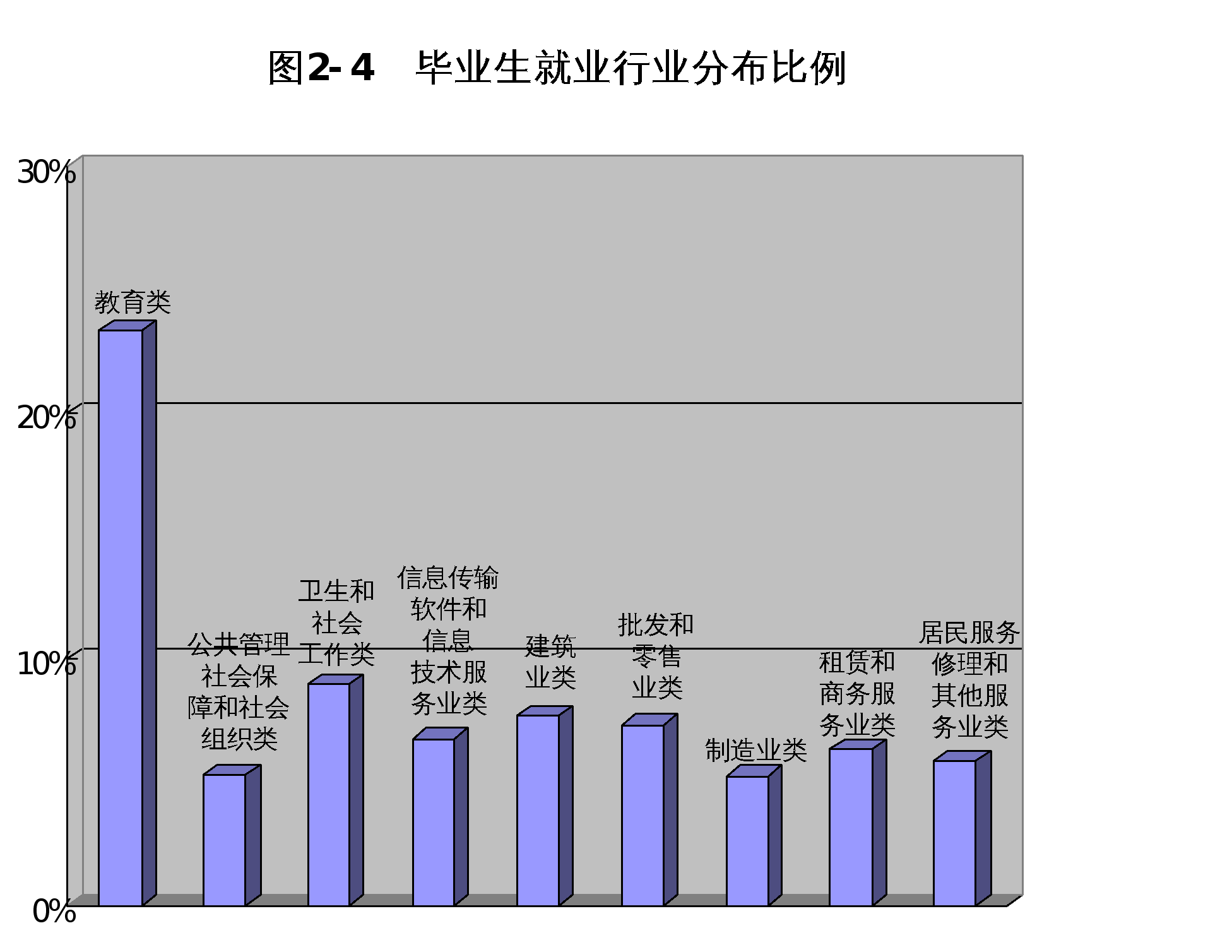 (3)按单位行业划分,接收beat365毕业生较多的行业主要有教育类,就业568人,占已就业人数的23.35%;公共管理、社会保障和社会组织类,就业129人,占已就业人数的5.30%;卫生和社会工作类,就业218人,占已就业人数的8.96%;信息传输、软件和信息技术服务业类,就业165人,占已就业人数的 6.78%;建筑业类,就业187人,占已就业人数的 7.69%;居民服务、修理和其他服务业类,就业143人,占已就业人数的 5.88%;批发和零售业类,就业178人,占已就业人数的 7.32%;制造业类,就业128人,占已就业人数的 5.26%;租赁和商务服务业类,就业154人,占已就业人数的 6.33%。具体分布情况见图2-4。