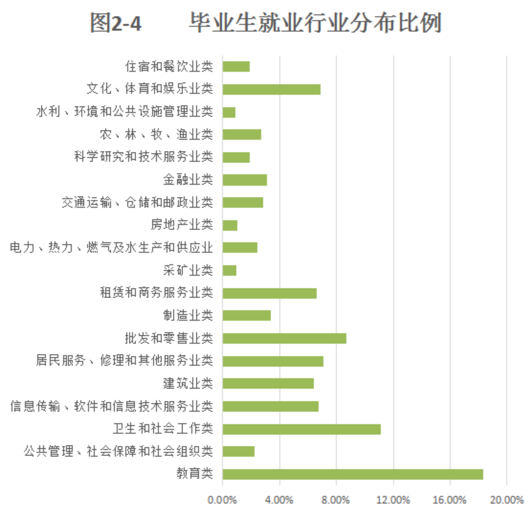 (3)按单位行业划分,接收beat365毕业生较多的行业主要有教育类,就业498人,占已就业人数的18.35%;公共管理、社会保障和社会组织类,就业60人,占已就业人数的2.21%;卫生和社会工作类,就业302人,占已就业人数的11.13%;信息传输、软件和信息技术服务业类,就业183人,占已就业人数的 6.74%;建筑业类,就业174人,占已就业人数的 6.41%;居民服务、修理和其他服务业类,就业193人,占已就业人数的 7.11%;批发和零售业类,就业237人,占已就业人数的 8.73%;制造业类,就业91人,占已就业人数的 3.35%;租赁和商务服务业类,就业180人,占已就业人数的 6.63%;采矿业类,就业26人,占已就业人数的 0.96%;电力、热力、燃气及水生产和供应业,就业67人,占已就业人数的 2.47%;房地产业类,就业28人,占已就业人数的 1.03%;交通运输、仓储和邮政业类,就业77人,占已就业人数的 2.84%;金融业类,就业84人,占已就业人数的 3.10%;科学研究和技术服务业类,就业52人,占已就业人数的1.92%;农、林、牧、渔业类,就业74人,占已就业人数的2.73%;水利、环境和公共设施管理业类,就业25人,占已就业人数的0.92%;文化、体育和娱乐业类,就业187人,占已就业人数的6.90%;住宿和餐饮业类,就业52人,占已就业人数的1.92%;具体分布情况见图2-4。