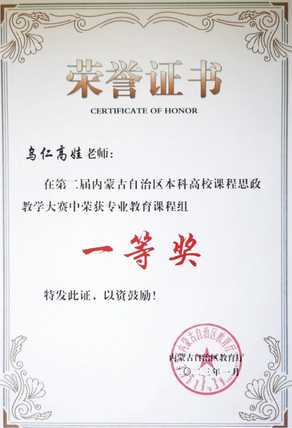 教育教学 教师服务 首页 > 教育教学 > 创建优良教风、争做优秀教师-乌仁高娃 | 来源: 更新时间:2023-09-27 创建优良教风、争做优秀教师姓名:乌仁高娃专业:病原生物学职称:副教授获奖证书