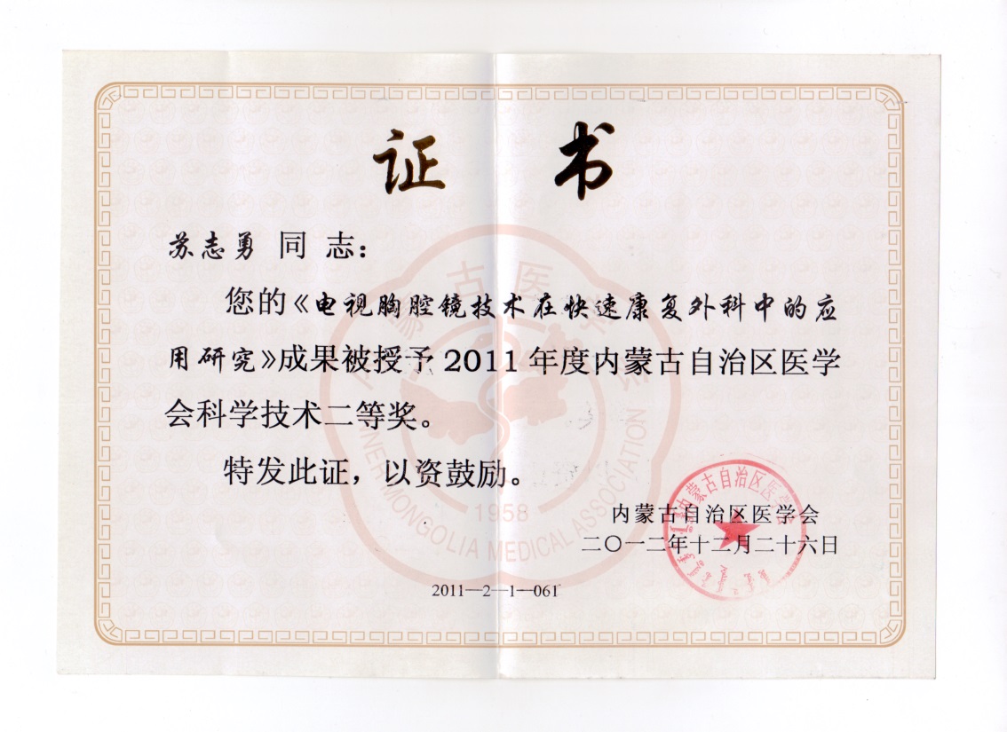 电视胸腔镜技术在快速康复外科中的应用研究,2011年获“内蒙古医学会科学技术二等奖”