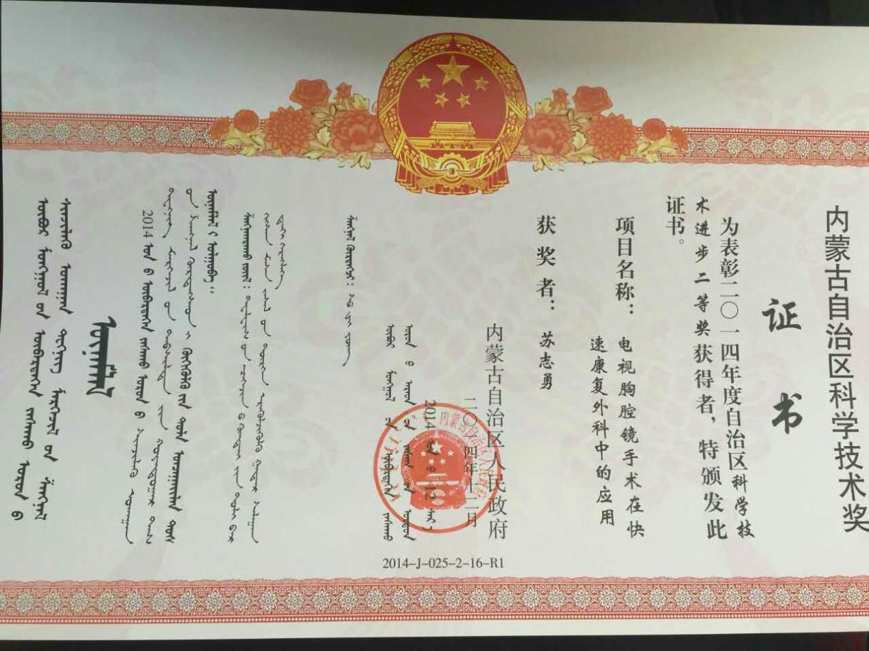 电视胸腔镜技术在快速康复外科中的应用研究,2014年获“内蒙古自治区科技进步二等奖”