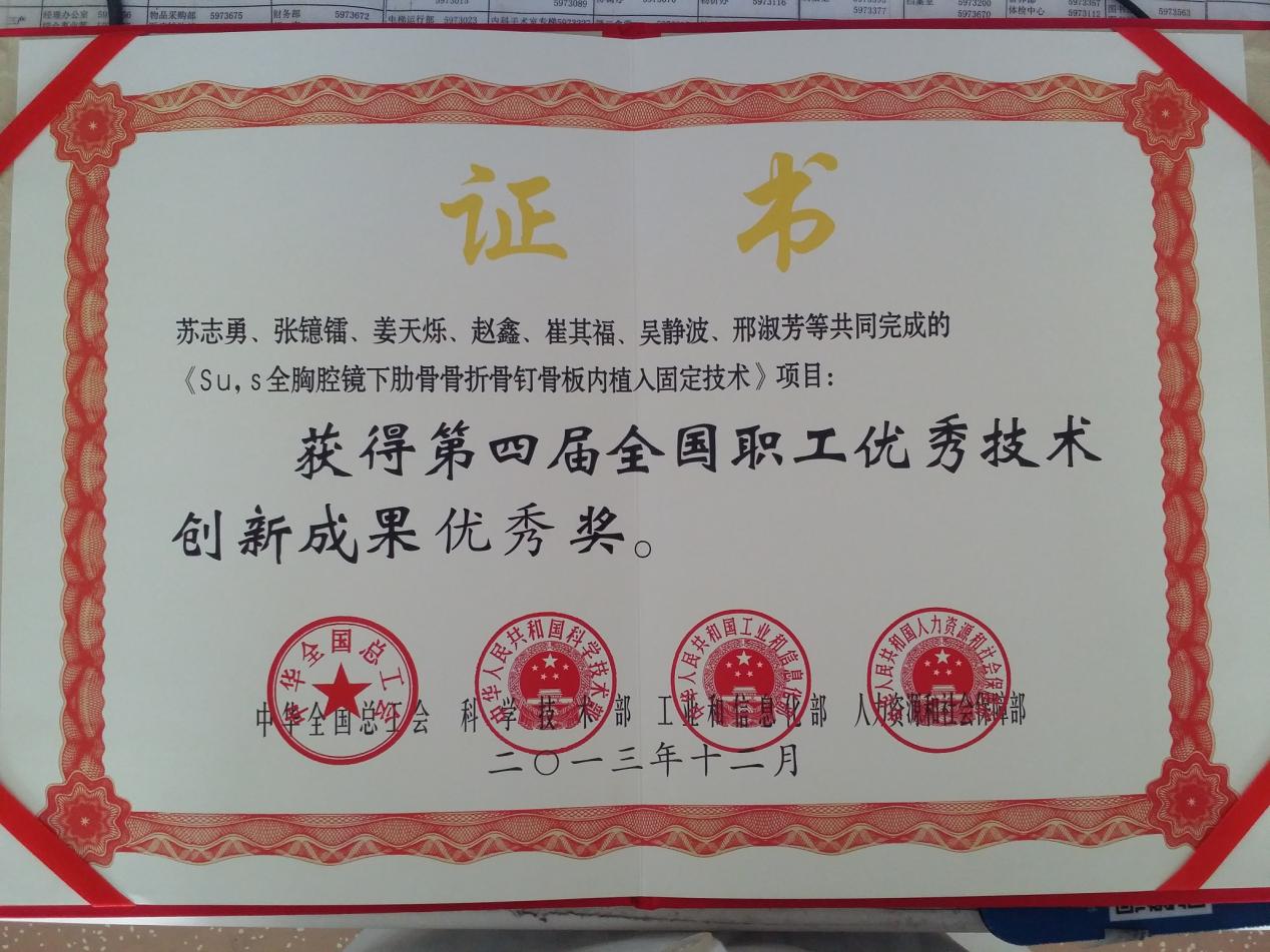 SU’S全胸腔镜下肋骨骨折骨钉骨板内植入固定技术,2013“第四届全国现代职工优秀技术创新成果优秀奖”