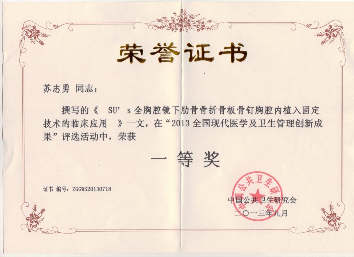SU’S全胸腔镜下肋骨骨折骨钉骨板内植入固定技术,2013年得“全国现代医学及卫生管理创新成果一等奖”