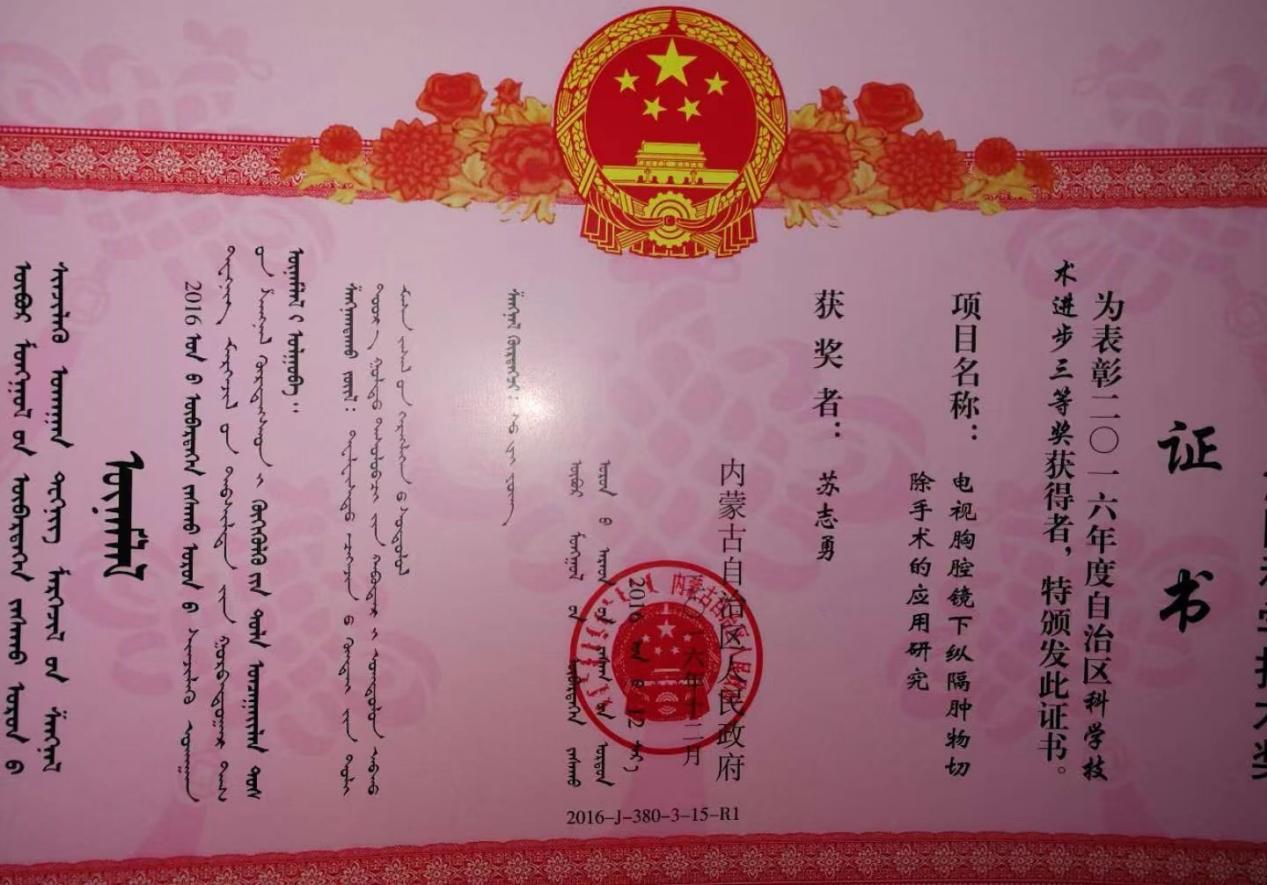 电视胸腔镜下纵隔肿物切除手术的应用研究,2016年获“内蒙古自治区科技进步三等奖”