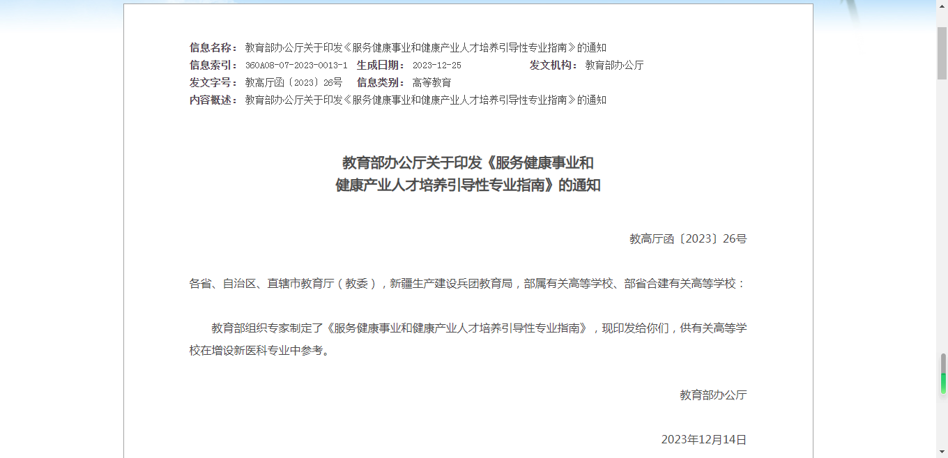 通知公告 首页 > 通知公告 专业动态| 教育部办公厅关于印发《服务健康事业和健康产业人才培养引导性专业指南》的通知 | 来源: 更新时间:2024-01-05 Beat365|官方网站教育部办公厅关于印发《服务健康事业和健康产业人才培养引导性专业指南》的通知 附件: 初审:孙会艳终审:张俊毅