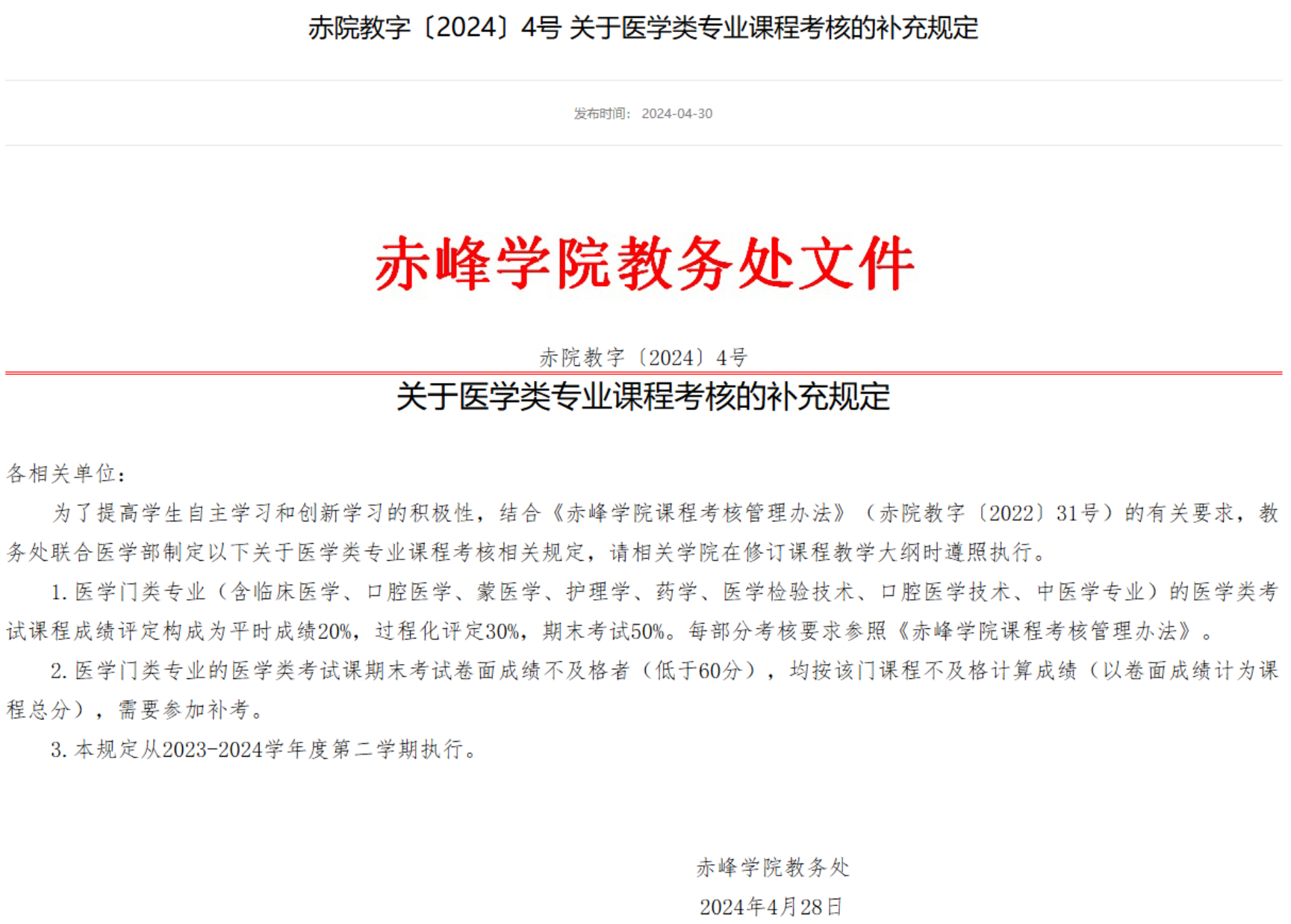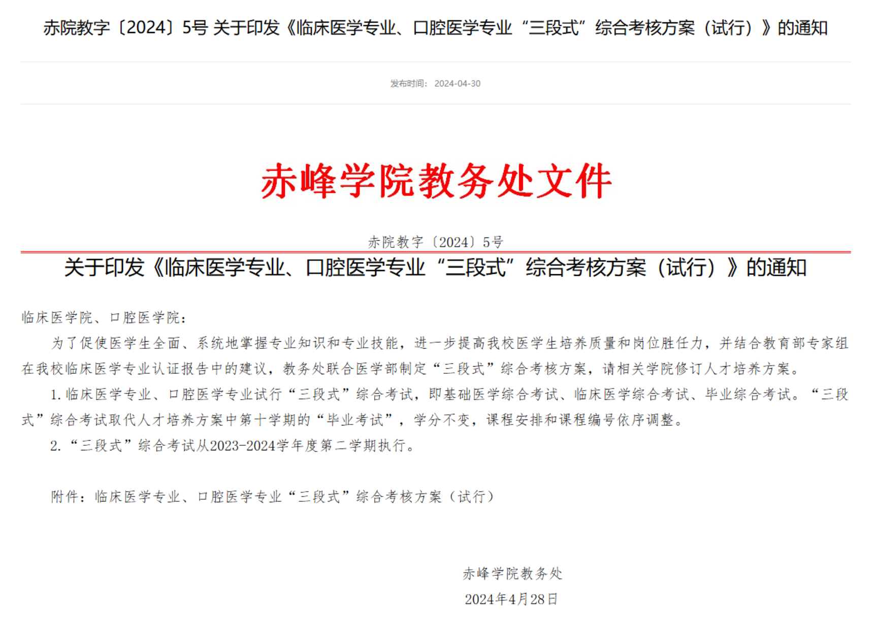 通知公告 首页 > 通知公告 工作提示2024.6.19 | 来源: 更新时间:2024-06-21 Beat365|官方网站 工作提示 根据教务处印发的关于医学类专业课程考核的补充规定赤院教字〔2024〕4号和关于印发《临床医学专业、口腔医学专业“三段式”综合考核方案(试行)》的通知(赤院教字〔2024〕5号)文件,下学期开始,各医学教学单位严格按照文件精神开展教学工作。 医学部2024.6.19