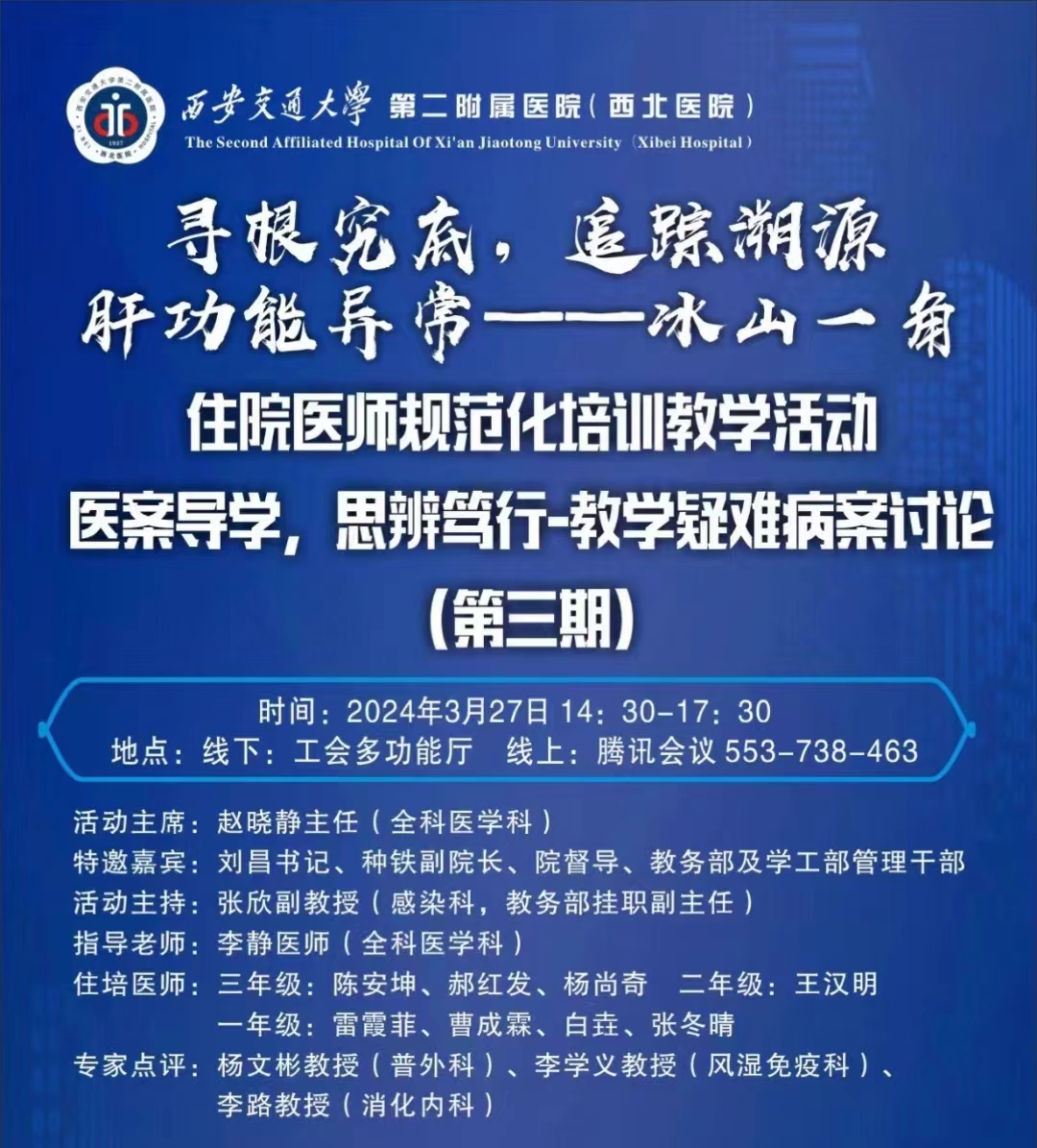 通知公告 首页 > 通知公告 教学通知| 住院医师规范化培训教学活动 | 来源: 更新时间:2024-03-27 Beat365|官方网站教学通知| 住院医师规范化培训教学活动 医学教育各二级学院:医学部组织教师和学生线上学习西安交通大学第二附属医院(西北医院)组织的“寻根究底追踪 溯源肝功能异常 冰山一角”住院医师规范化培训教学活动,“以案导学、思辨笃行”教学疑难病案讨论。时间:2024年3月27日14:30-17:30。地点:线上腾讯会议553738463。详见附件。beat365官方网站医学部2024年3月26日附件: