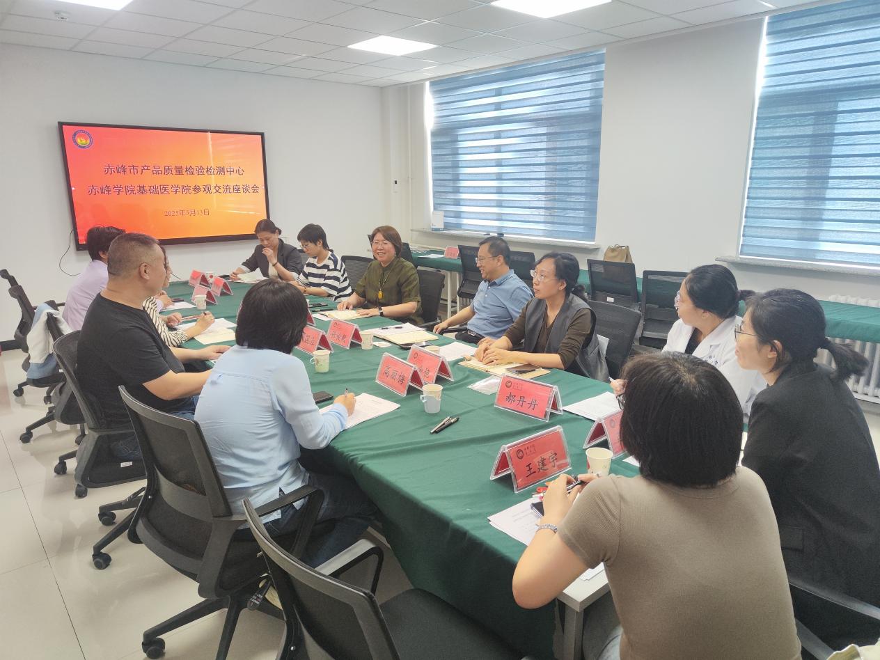 2025 年 5 月 13 日下午 3 点,beat365官方网站崇理楼 C 座 434 会议室,赤峰市产品质量检验检测中心郑丽娟副主任带队与beat365官方网站基础医学院展开参观交流座谈会,会议由beat365官方网站医学部常务副部长张俊毅主持。