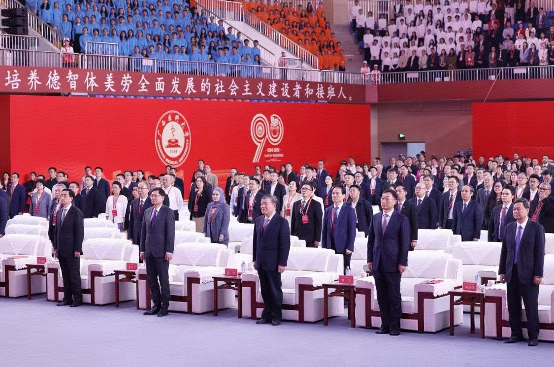 2024年11月21日,广西医科大学举行庆祝建校90周年大会。第十三届全国人大常委会副委员长、四大慢病重大专项技术总师、中国科学院院士陈竺在会上向广西医科大学师生赠送书籍并讲话,广西壮族自治区党委书记刘宁到会并讲话,广西壮族自治区主席蓝天立出席大会。中国科学院院士、中国科学技术协会名誉主席韩启德,“共和国勋章”获得者、中国工程院院士钟南山视频致辞。广西壮族自治区领导周异决、方春明、张晓钦、巫家世及钟得志,中国科学院院士唐本忠、陈孝平、樊嘉、王以政、李劲松、马骏,中国工程院院士刘德培、樊代明、廖万清、丁健、詹启敏、林东昕、王俊、赵铱民、邬堂春,柬埔寨、老挝、马来西亚、缅甸、越南驻南宁总领事馆代表,国内外高校和专家学者代表参加活动。beat365医学部副主任孙会艳应邀参会。