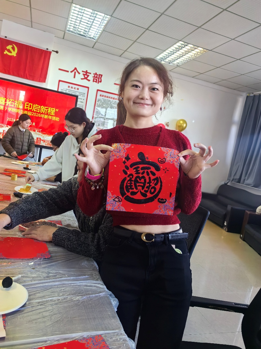 在2026年新年来临之际,为丰富教职工精神文化生活,弘扬优秀传统文化,营造喜庆浓厚的节日氛围,12月30日上午,我院举办“欢喜拓福印启新程”主题迎新年活动。