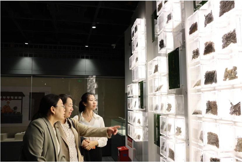 考察第二站,参观广东中医药博物馆。医史展厅通过珍贵的中医药文物与资料,展现中医药学的发展历史和岭南医学的独特成就。中药馆展厅里展出了常用中药、道地中药、珍稀中药、岭南中药、海洋类药等药材、药物标本及各类中成药。针灸馆介绍了历代针灸的代表文物,介绍了八段锦、推拿、拔罐、火针、刮痧灸法,以及岭南针灸、人体经络图、小儿推拿等医疗技术,还有历代与针灸学有关的医书。