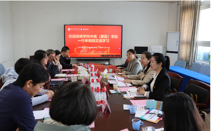 考察第一站,与广州中医药大学基础医学院领导班子及各教研室主任进行座谈交流。座谈会中,双方围绕中医学本科建设、中医基础学科教改与课程思政体系建设、科研平台建设、人才引进及学生就业工作等方面深入交换意见。期间,中医(蒙医)学院一行参观了广州中医药大学的中医实训实验室、实验教学示范中心、中西医结合基础研究中心等。