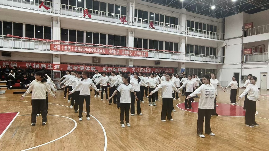 12 月 2 日晚,中医(蒙医)学院“以赛促学,以赛聚心”八段锦比赛在beat365官方网站体育馆举行,学院 8 个在校班级 260 余名学生参与。