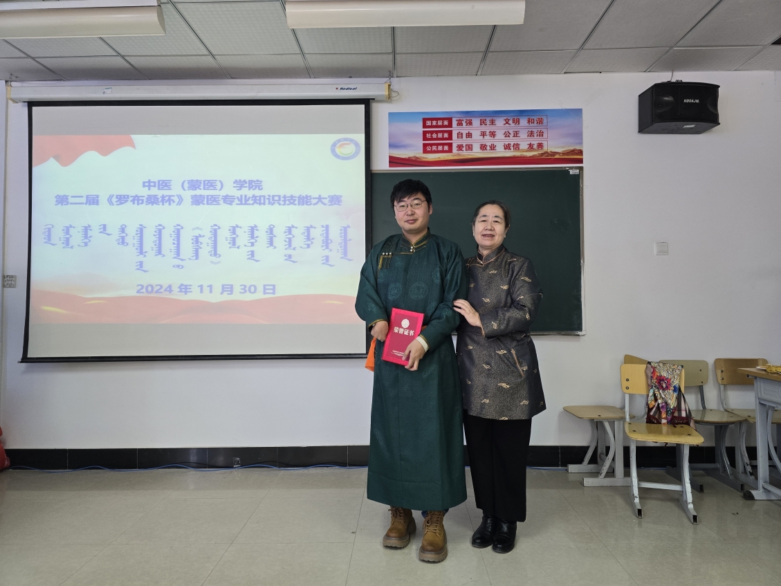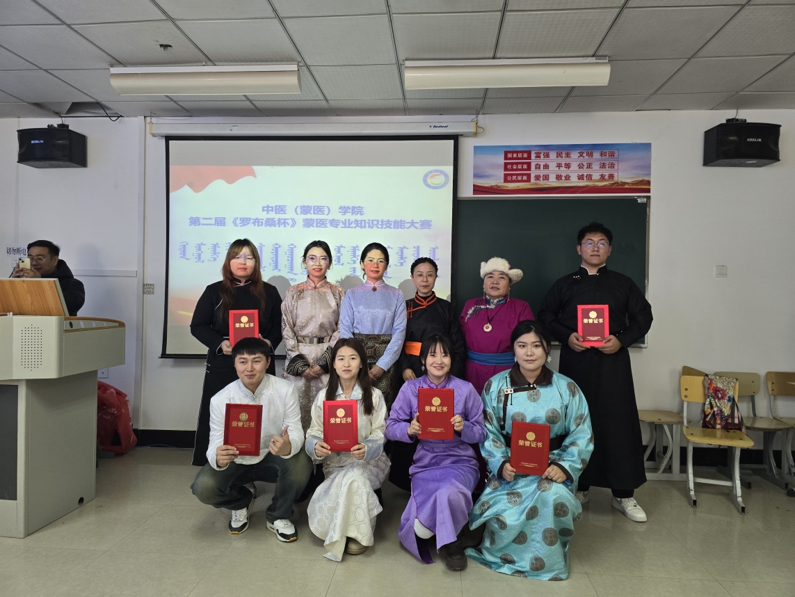 本次比赛共有2021级、2022蒙医本科班、24级蒙医专升本班6支代表队参加。大赛设个人必答、小组必答、抢答、风险题、铸牢中华民族共同体意识题等五个环节。各组选手团结协作、配合默契、踊跃作答。经过激烈角逐,2024级蒙医专升本根小、萨仁满都拉、22级领福同学获得一等奖;2021级阿斯罕、特日格乐、2024级蒙医专升本白秀清及2021级白德力根呼、乌日力嘎、邱亚萍同学获得二等奖;2021级明灵、乌日雅、薛燕、2021级雅茹,阿布日格、2024级蒙医专升本呼木吉乐、22级苏尼尔、李建明、21级乌日鲁格同学获得三等奖;2024级蒙医专升本萨仁满都拉同学获得最佳选手。