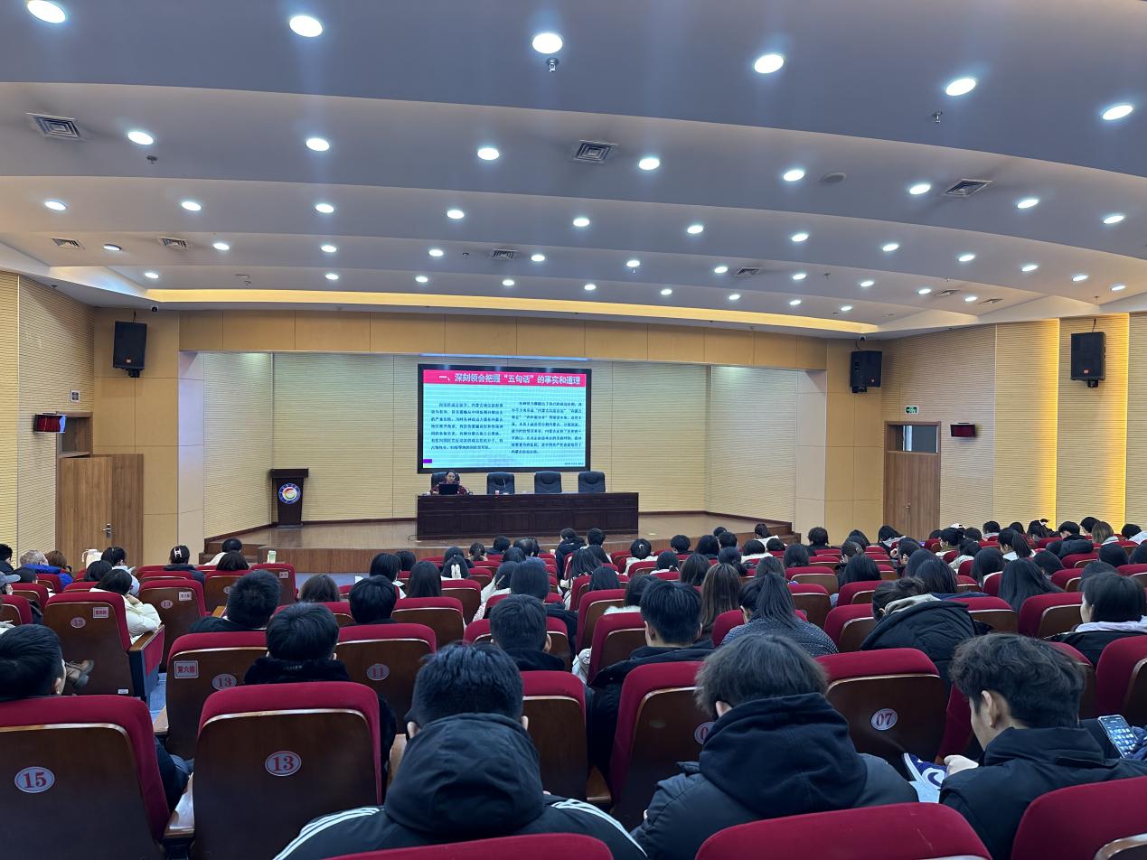 宣讲会上,银特妮拉科长聚焦“感党恩、听党话、跟党走”主题,从深刻领会把握“五句话”的事实和道理,深切领会体悟习近平总书记对内蒙古的关怀厚爱和期望重托,深入学习领会、全面准确把握《意见》精神,以强烈的感恩之心和奋进之志抓好《意见》贯彻落实四个方面,进行了深入阐释和系统讲解。宣讲报告主题鲜明、内容翔实、脉络清晰、内涵深刻,对与会师生深刻领会习近平总书记对内蒙古的重要指示精神、准确把握“五句话”的事实道理具有很强的指导意义。聆听宣讲报告后,大家一致表示,要牢记“五句话”的事实和道理,切实把对习近平总书记和党中央的感恩感激之情转化为牢记嘱托、感恩奋进的生动实践,紧抓重大历史机遇,以铸牢中华民族共同体意识为主线,主动作为、真抓实干,以办好两件大事的实际行动,在建设“两个屏障”“两个基地”“一个桥头堡”上展现新作为,奋力书写中国式现代化内蒙古新篇章。
