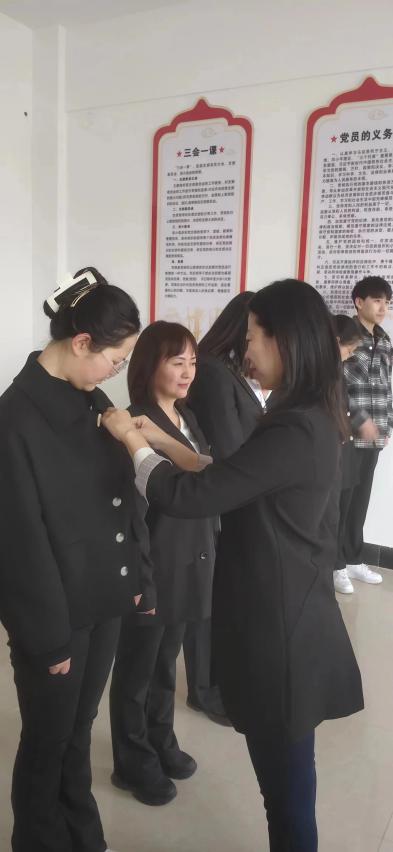 仪式上,党总支副书记申洋宣读了党委的批复,出席仪式的老党员为新党员佩戴了党徽,全体预备党员面向党旗庄严宣誓,老党员重温入党誓词。仪式上,新党员学生代表发言表示了决心,老党员教师代表发言表示热烈的欢迎和未来的期盼。最后,党总支书记孙伟勤总结讲话,对新党员三个层面的学习提出了要求。