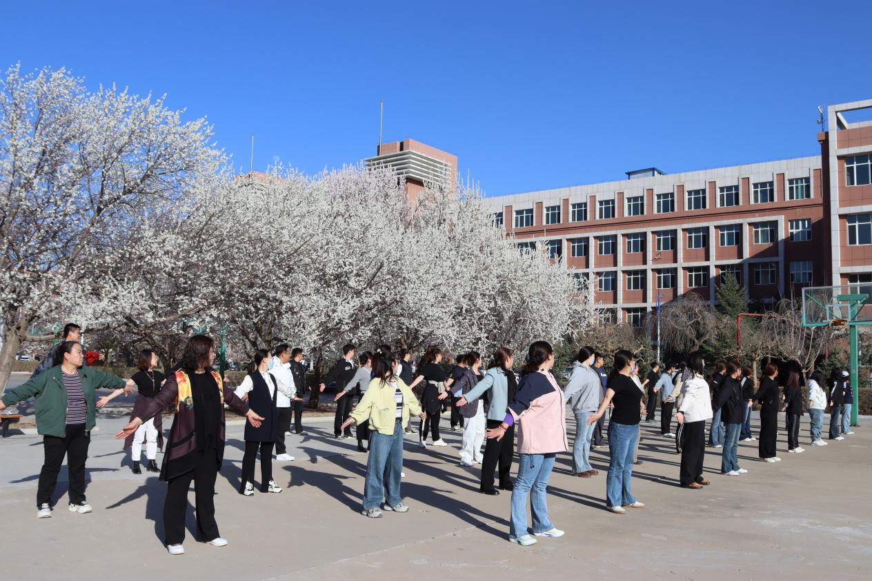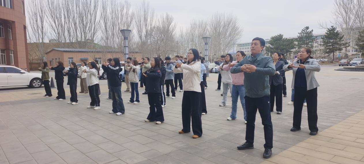 从“双手托天理三焦”到“摇头摆尾去心火”,一招一式舒展流畅,既彰显中医“阴阳调和”的养生精髓,又融入蒙医“三根平衡”的健康智慧。阳光下,青年学子与教师同频共练的身影,成为医学楼前一道独特的风景。