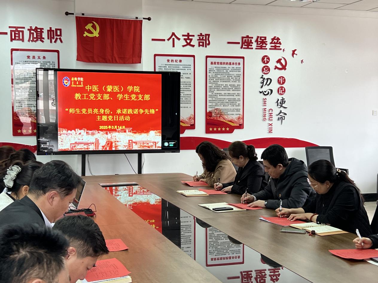 2025年3月14日,中医(蒙医)学院党总支在崇仁楼208会议室举办主题为“师生党员亮身份,承诺践诺争先锋”的主题党日活动。此次活动由学生党支部书记娜仁主持,中医(蒙医)学院全体党员及部分师生入党积极分子共同参与。
