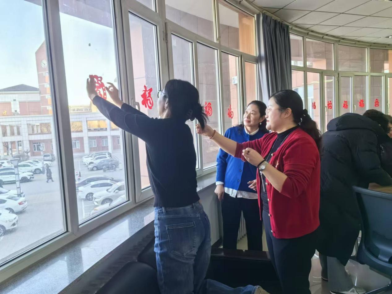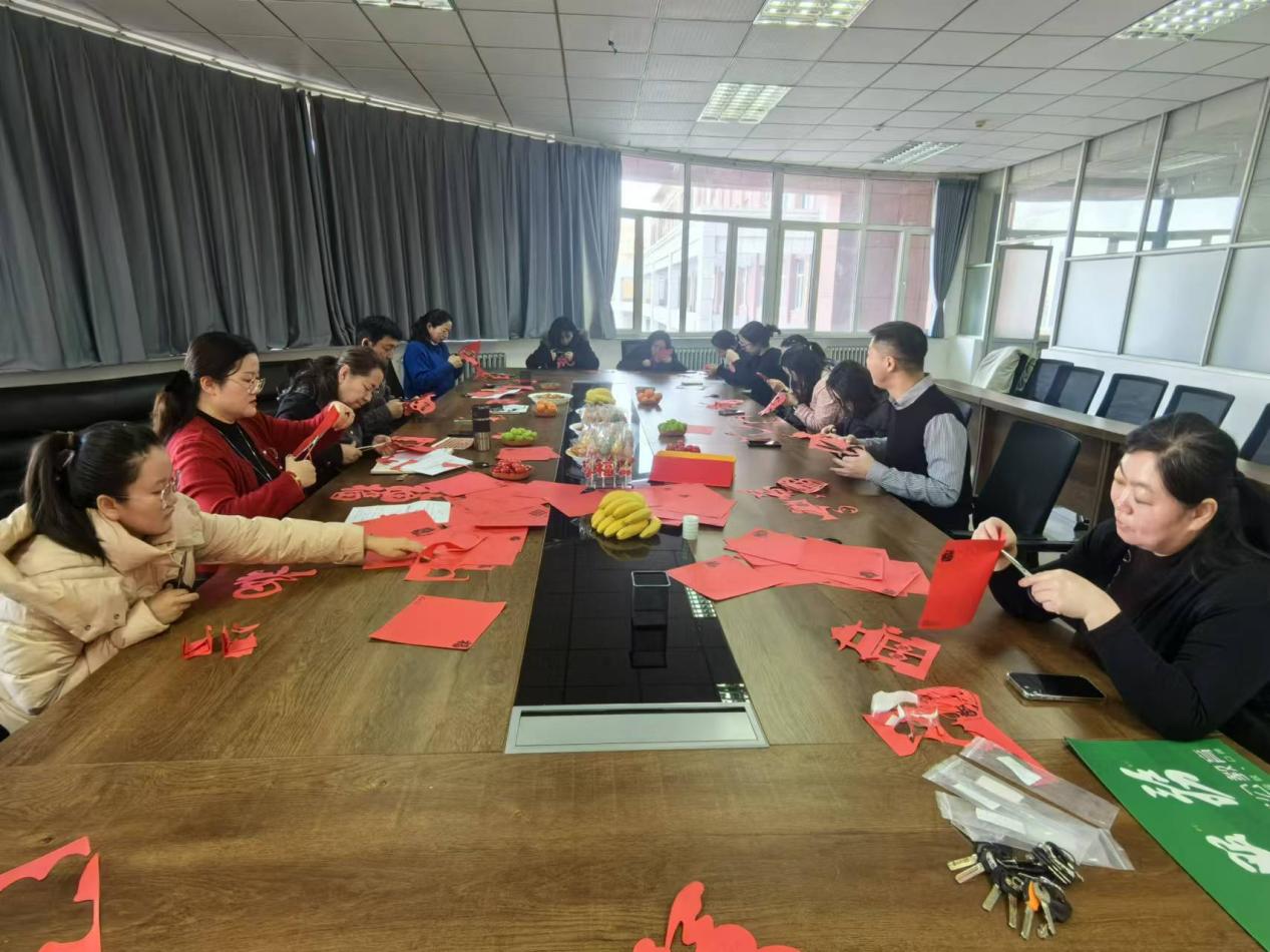 活动在师生的憧憬未来、声声祝福中拉开序幕。大家围坐桌边,一边感悟着中华优秀传统文化的魅力、讨论着剪纸的技巧,一边亲手实践,每一剪刀都那么的细致认真。随着剪刀飞舞,谈笑间“惟妙惟肖”、“活灵活现”的“福”字作品在一双双巧手的创作下“新鲜出炉”,呈现在指尖。整个活动充满了欢乐、祥和的新年气息,脸上洋溢着笑容。剪纸结束,每人将作品张贴在窗上,将现场布置的温馨而充满活力,处处洋溢着节日的氛围。
