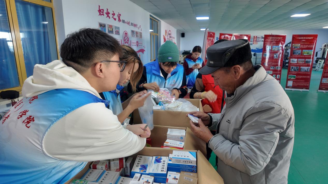 活动由两个部分组成,9日下午全体人员参观了锡林郭勒盟铸牢中华民族共同体意识实践基地,沿着书记2014年考察路线,感受总书记对内蒙古各族人民的关心与厚爱,在蒙古马精神展厅、党员中心户展馆和守望相助铸牢中华民族共同体意识展厅,深刻领悟了习近平总书记在民族团结进步表彰大会上的讲话精神,并从锡林浩特市民族团结进步创建历程和基层党建工作中学到了宝贵经验。10日上午,随行的师生志愿者与巴彦宝拉格苏木六十余名各族群众亲切交流,开展了建立健康手册、蒙医疗术、中医号脉、肩颈部按摩等诊疗活动,为群众解除病痛;为等候义诊的群众详细讲解并示范心脏骤停最佳急救时间和正确心肺复苏操作要求和步骤;同时,随行师生与当地志愿者将同学们制作的具有芳香避秽、净化空气等功效的香囊和健康知识卡片送给有需要的群众。