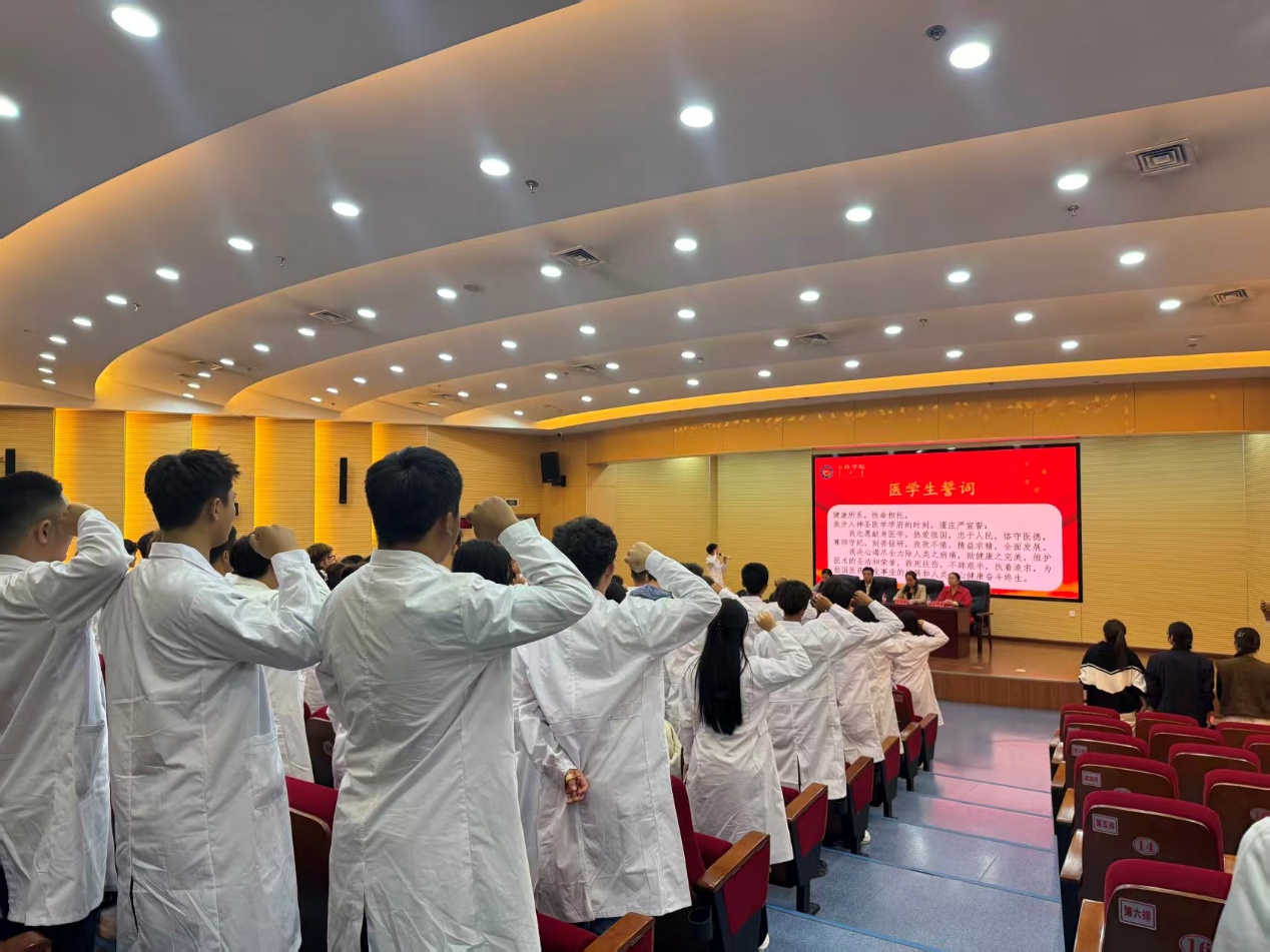 孙琪老师带领全体师生庄严宣读《医学生誓言》。铿锵有力的誓言回荡全场,彰显了师生们投身医学事业的坚定信念与责任担当。