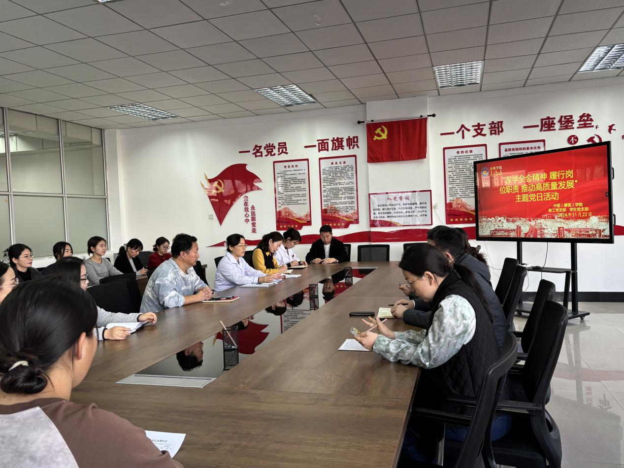 11月22日,中医(蒙医)学院教工党支部和学生党支部联合开展“深学两会精神 履行岗位职责 推动高质量发展”主题党日活动,学院领导班子及全体党员参加活动。活动由教工党支部书记周红伟主持。