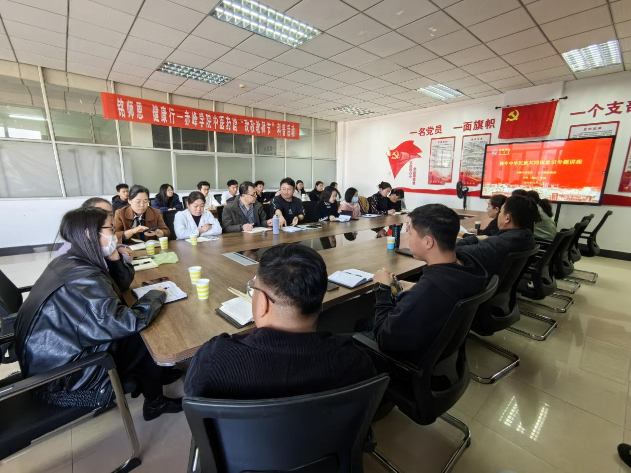 11月12日下午,中医(蒙医)学院邀请赤峰市委党校王立媛副教授以《铸牢中华民族共同体意识 谱写新时代民族团结进步事业新篇章》为题作专题讲座,全体教职工及“青马班”学员、入党积极分子聆听讲座。